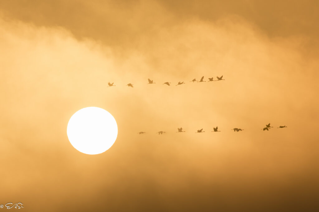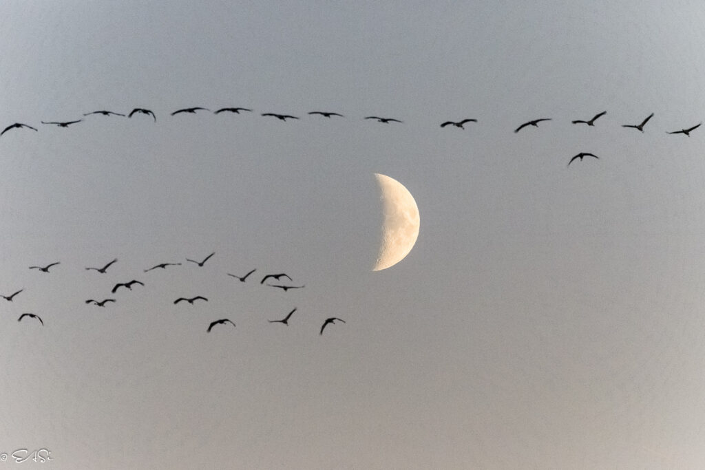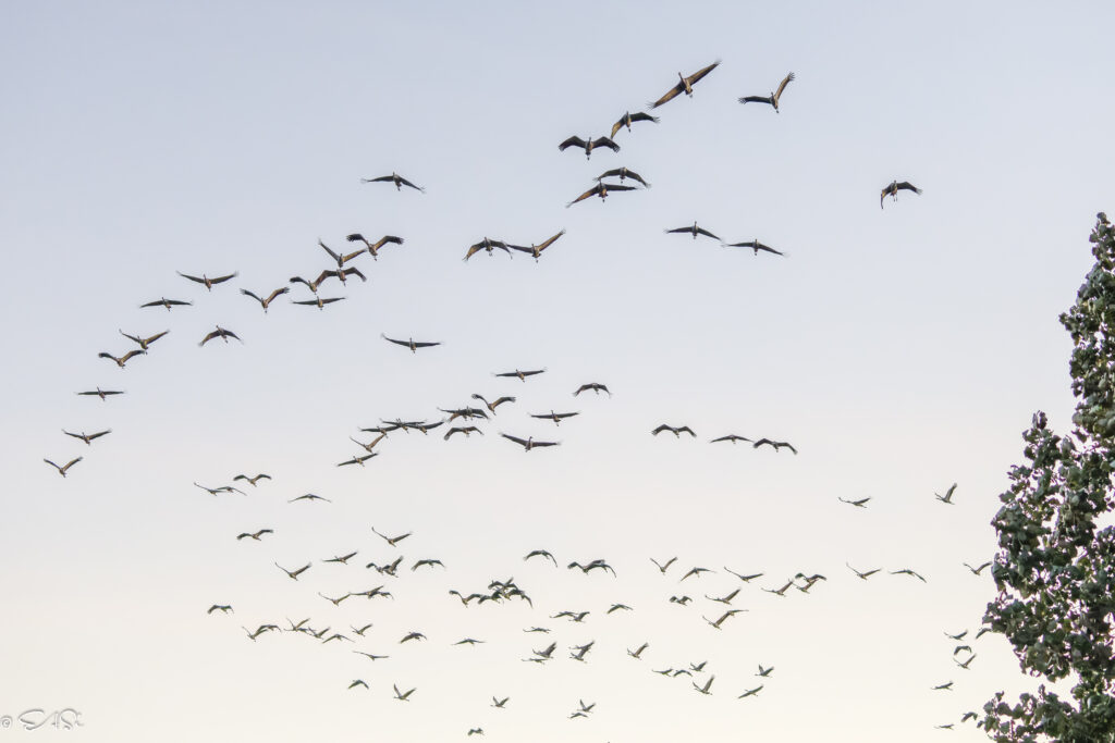 Manche Vogelschwärme sind so groß, dass man alle Gruppenmitglieder nicht auf einmal mit der Digitalkamera erfassen kann. Mit der Kamera meines Smartphones konnte ich hier die Überflieger in ihrer typischen V-Formation filmen und dadurch auch den Klang ihrer Trompeten aufnehmen.