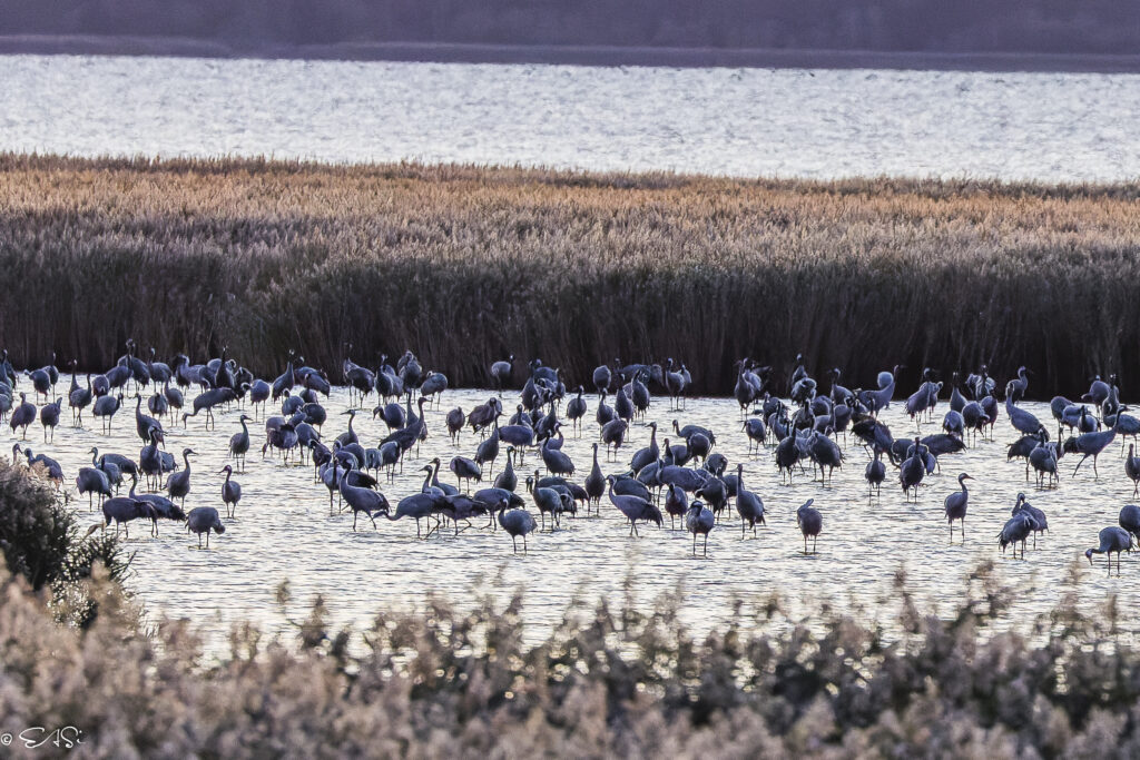 Tagsüber können die grauen Vögel auf den Feldern im Hinterland der Halbinsel Fischland-Darß-Zingst bei der Suche nach Futter, beim Putzen des Gefieders, beim Spielen, Streiten, Tanzen und beim Trompeten beobachtet werden. Bei Sonnenaufgang verlassen sie ihre sicheren Schlafplätze in großen Gruppen bei Pramort und kehren bei Sonnenuntergang wieder dorthin zurück. Zum Leidwesen des Fotografen ist dann nur noch wenig Licht vorhanden. Deswegen muß die ISO Zahl (Auflösung) immer weiter hoch geschraubt werden, was die Bildqualität beeinträchtigt (Rauschen). In der freien Natur fordert außerdem tagsüber die Fluchtdistanz der Vögel und der Sonnenstand (Gegenlicht) die Fotografen heraus. Schließlich sind nicht nur 2 oder 3 Kraniche unterwegs sondern manchmal so viele, dass man nicht weiß wo man mit fotografieren anfangen werden soll.