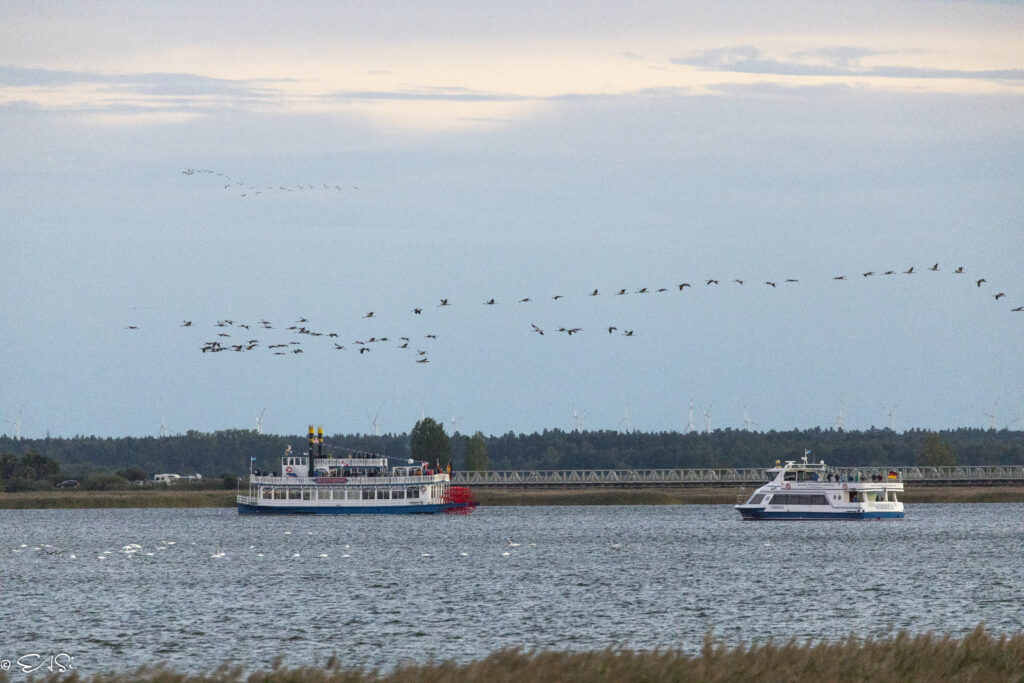 Die Beobachtung des Einflugs auf die Grosse Kirr von einem Ausflugsschiff ist ab Hafen Zingst möglich, aber nicht erforderlich. Das Geld kann eher in ein oder besser zwei lecker Fischbrötchen investiert werden.