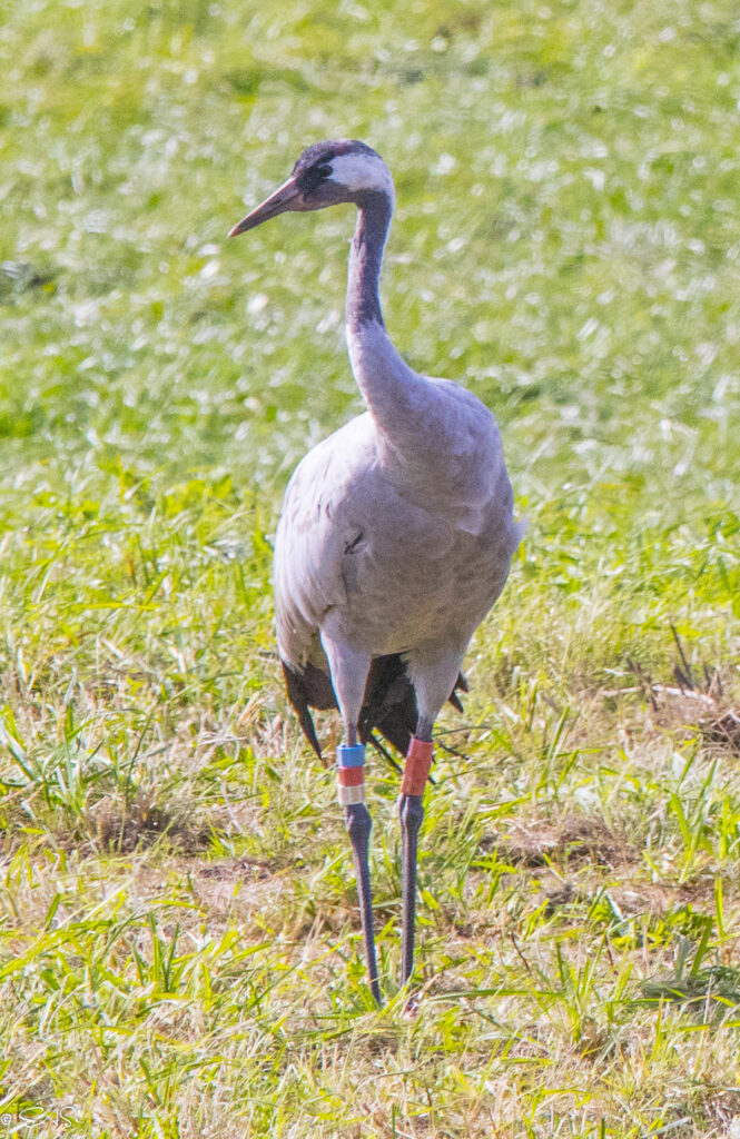 Vor dem Kranorama konnten zwei beringte Kraniche gesichtet werden. Das Foto zeigt ein Beispiel mit der Markierung 3 mal rot am linken Bein – steht für Schweden oder Norwegen. Ein anderer trug 3 grüne Ringe – steht für Polen.