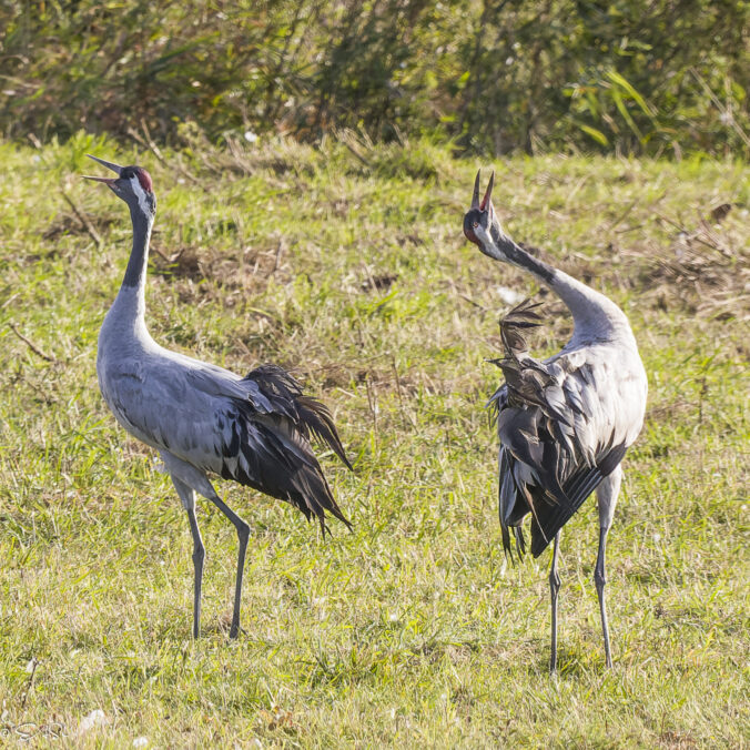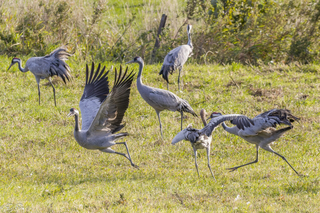 Auf den nahen Wiesen vor dem zweistöckigen Kranorama wird Futter (Mais / Weizen) ausgestreut um die Tiere von der Futtersuche auf den Feldern abzulenken (Ablenkfütterung). Das lockt die Graukraniche und Gänse an und schont die Felder der Bauern. Mit Spektiven oder Teleobjektiven gelingt die Beobachtung hier recht zuverlässig und sehr gut. Die Jungvögel erkennt man an ihrem bräunlichen Gefieder. Die haben aber schon annähernd die gleiche Größe wie die erwachsenen Vögel mit ihrem grauen Gefieder und roten Hinterkopf. Erstaunlich, dass sie nach wenigen Lebensmonaten schon den Weg ins Winterquartier angehen können. Zwei beringte Graukraniche konnte ich erkennen, einer wurde in Polen beringt, ein anderer in Schweden. Auf den Wiesen herrscht ein stetiges Landen und Starten. Ein Reh tritt auf die Bühne, evtl. verursacht es einen Massenstart von Graugänsen.