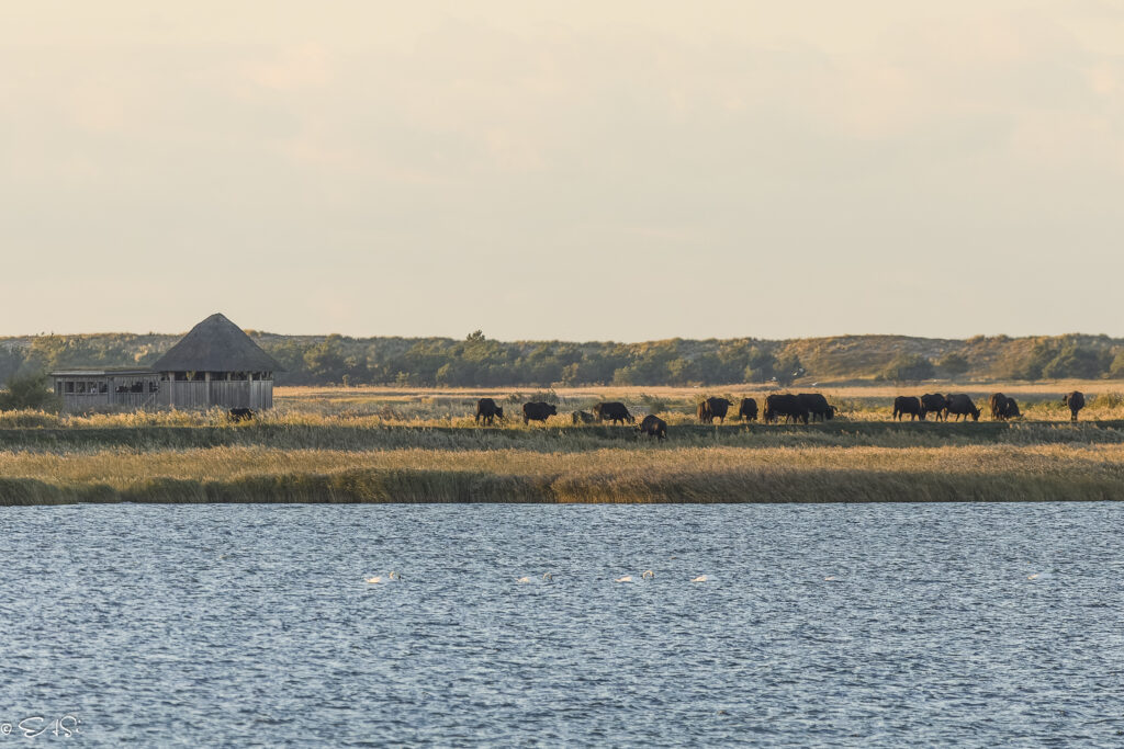 Leider darf das Schiff in den flachen Boddengewässern nur vorgegebene Routen fahren und auch nicht in die Nähe zu den Schlafplätzen der Kraniche. Ist auch gut so. Das Rotwild und die Wasserbüffel am Pramort können mit bloßem Auge kaum erkannt werden.
