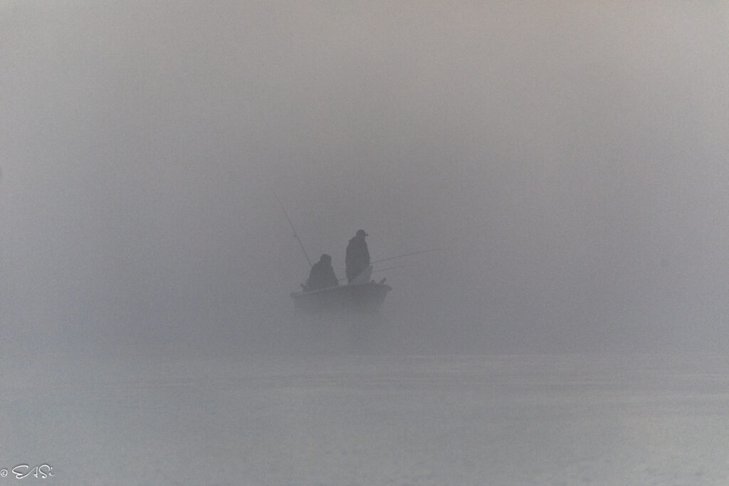 Sowohl von Land aus als auch auf Ausflugsschiffen ab Röbel oder Waren können hier die Graukraniche gesehen werden. Morgens gelingt die Beobachtung der Kraniche beim Start in ihren Tag mit der aufgehenden Sonne im Hintergrund. An diesem Morgen liegt Nebel über der Müritz, da die Lufttemperatur nur 2-3° C beträgt und das Wasser der Müritz deutlich wärmer ist. Angler im Nebel.