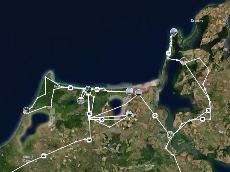 Die Insel Hiddensee darf von Touristen nicht mit PKWs besucht werden. Per Schiff geht es ab Schaprode über die Boddengewässer auf vorgegebenen Routen auf die Insel. Fahrräder dürfen mitgenommen werden. Die Strecke bis zum Leuchtturm Dornbusch beträgt ab Hafen Neuendorf ca. 12km.