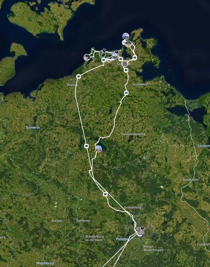 Nach einem Zwischenstopp in Berlin bei meiner Schwester Renate landeten wir auf der Halbinsel Fischland-Darß-Zingst in dem Ort Zingst auf dem Campingplatz Düne 6. Quartier für eine Woche. In Schaprode auf der Insel Rügen verbrachten wir zwei weitere Nächte und fuhren für einen Tagesausflug mit einem Schiff auf die Insel Hiddensee. Auf der Rückfahrt nach Berlin nahmen wir im Hafen von Röbel (Müritz) einen Stellplatz für eine Nacht. In Berlin blieben wir dann noch bis Mittwoch bei Renate für ein Fotoprojekt, für zwei interessante Besuche im Berliner Ensemble (Die 3 Groschenoper, De Profundis) für einen Besuch bei Sabine Zimmer und um Volker zu treffen, der am Dienstag noch dazu kam.